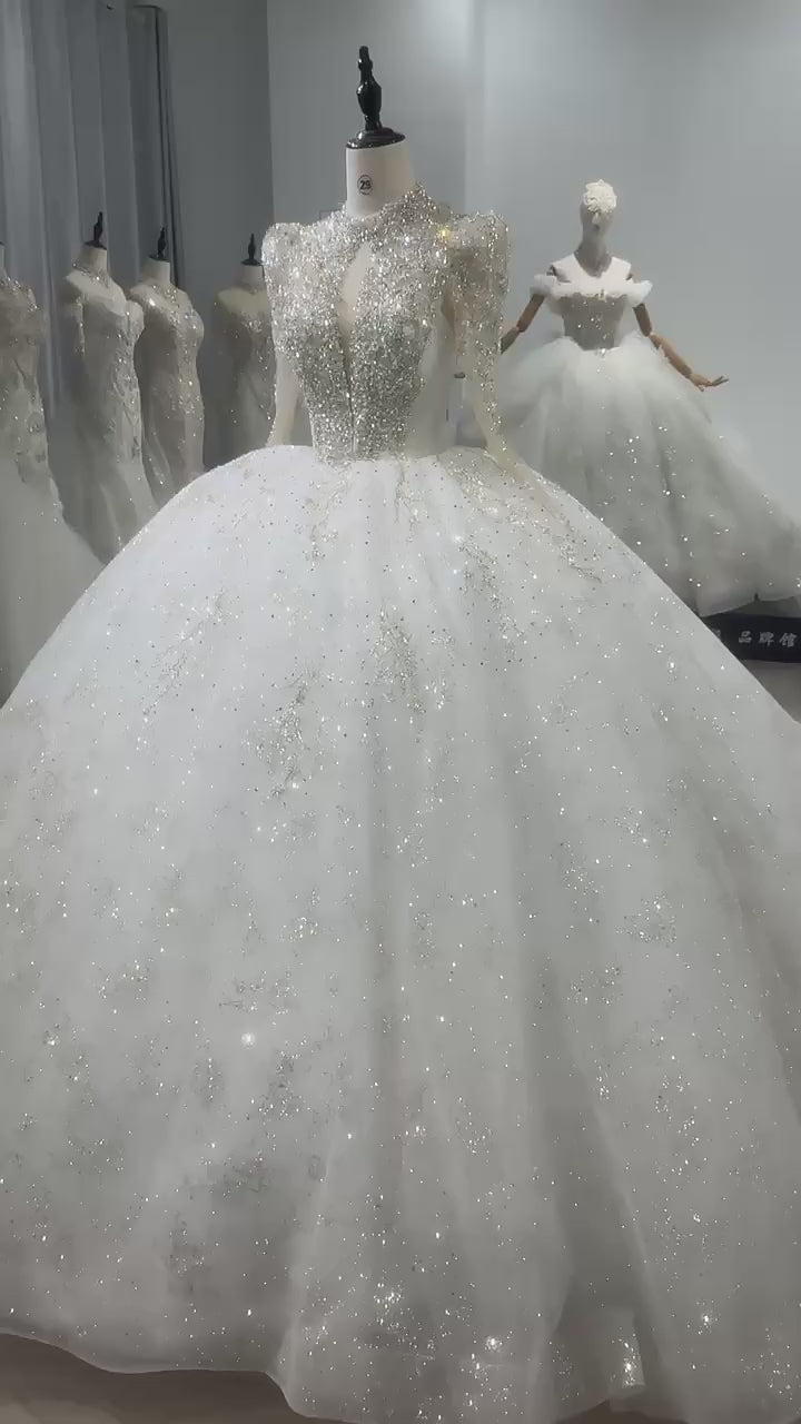 TW160 Wedding Dress High Neck Long Sleeve Lace Up Keyhole Back Wedding Dress Beading Sequins Star Ball Gown Bridal Dress