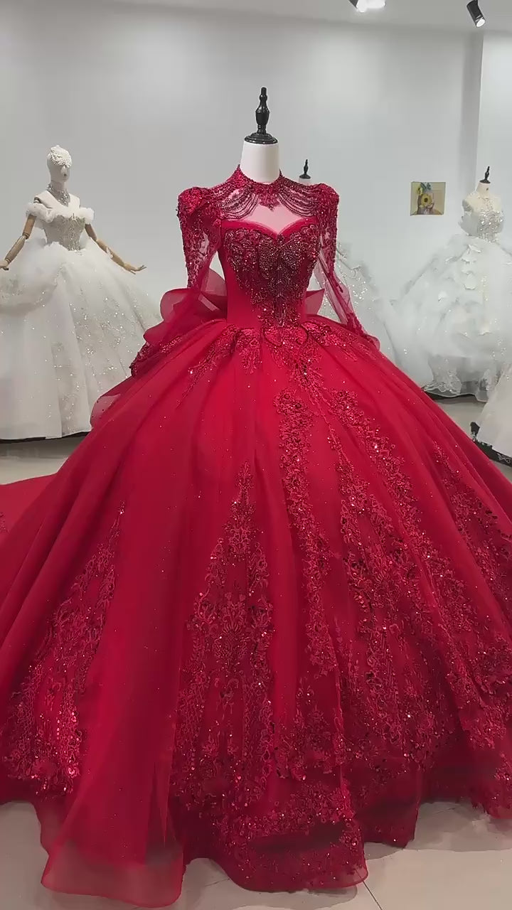 TW249 Women's Evening Dress High Long Sleeve Keyhole Back Crystal Embroidery Beaded Bow Red Long Dresses For Special Occasions