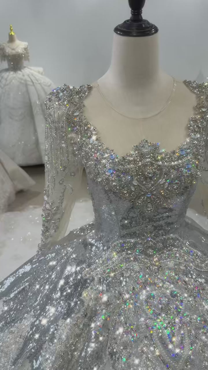 TW405 Modest Wedding Dresses Silver Long Sleeve Lace Up Back Crystal Vestito Da Matrimonio 2025