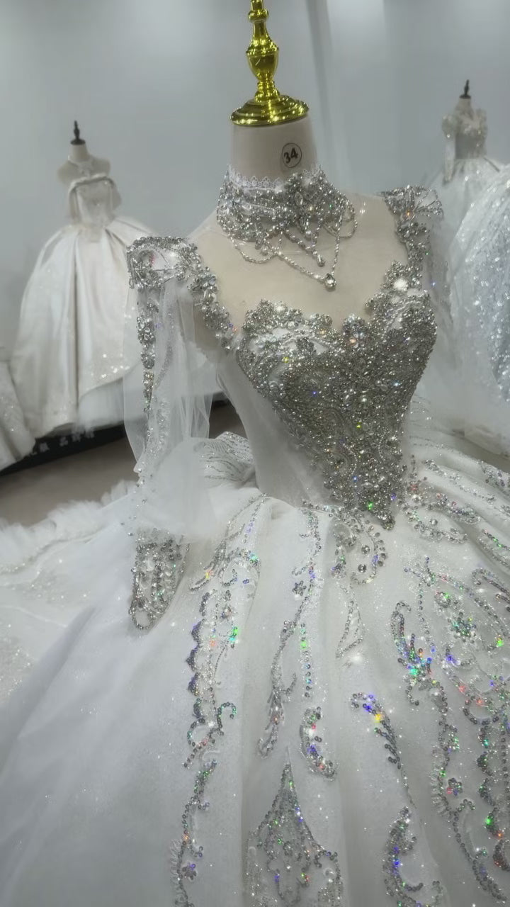 TW432 O-Neck Long Sleeve Lace-Up Back Ball Gown Bridal Dress Sequined Crystal Beading Customizable Luxury Wedding Dress