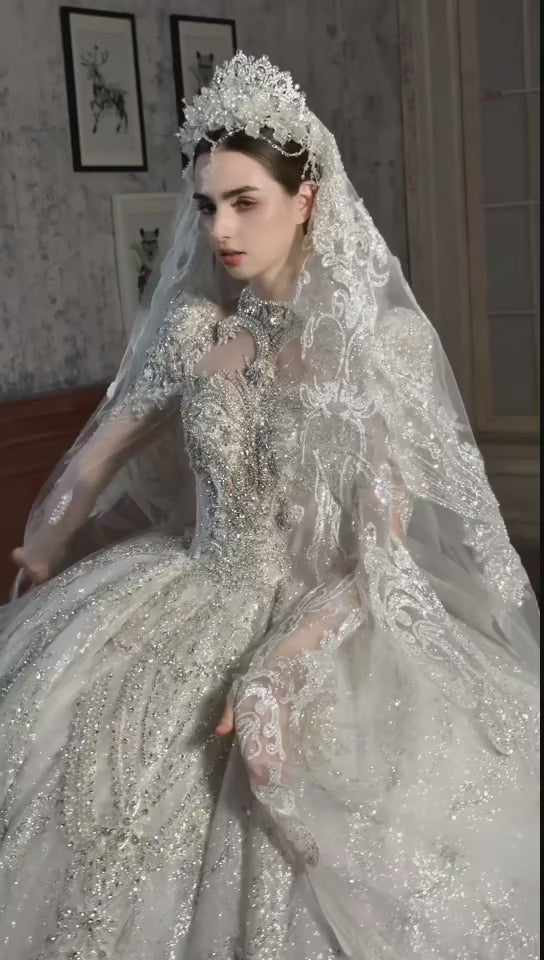 TW545 Luxury High Long Sleeve Lace Wedding Dress Beading Sequined Brides Customizable